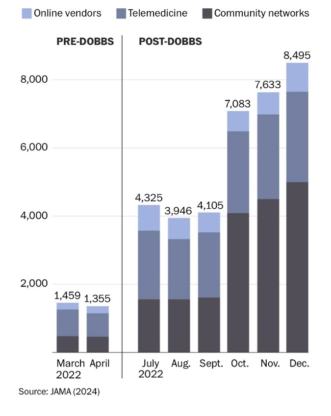 Telehealth abortions are now more than 20% of all abortions with thousands accessed under shield laws each month. Thousands of women in states with abortion bans and restrictions are receiving abortion pills in the mail from states that have laws protecting prescribers.
