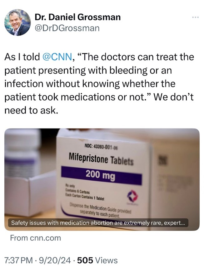 Yet Grossman admits that “retaining pregnancy tissue and requiring vacuum aspiration happens for 3% to 5% of people who have a medication abortion.” With one million abortions occurring in the U.S. in 2023, this represents thousands of adverse events every year.