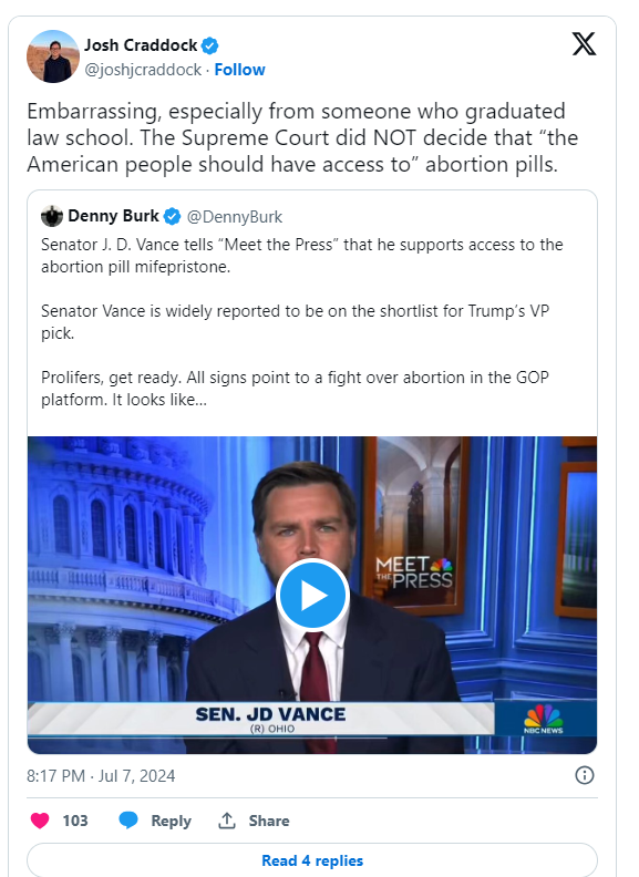 - Senator J.D. Vance: “On the question of the abortion pill…the Supreme Court made a decision saying that the American people should have access to that medication…”