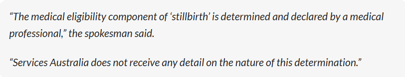 Dr Howe’s key contention is that Services Australia has no carve-out to say the stillbirth has to be natural as opposed to intentional. All that’s required is a letter from the hospital confirming that the baby was delivered stillborn.