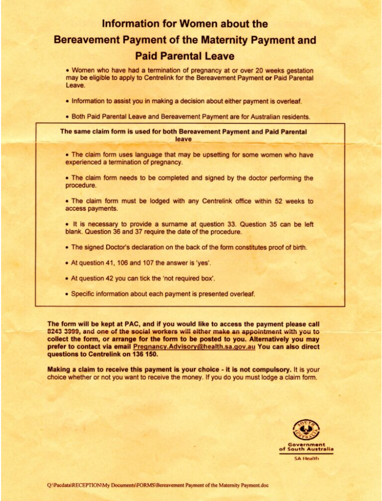 Issued by the South Australian Department of Health, the yellow A4 document provided detailed instructions for post-abortive women on how to apply for the Stillborn Baby Payment (then known as the Bereavement Payment) or Paid Parental Leave by registering their abortion as a stillbirth.