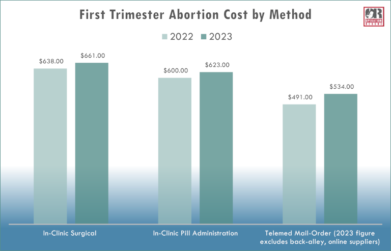 The price of abortions facilitated by brick-and-mortar clinics have inflated in every category. Surgical abortions increased from $638 to $661, in-clinic pill administration from $600 to $623, and telemed/mail-order abortions from $491 to $534.