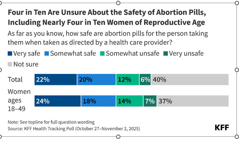Among women of reproductive age, the share viewing the pills as safe decreased from 59% to 41%, while larger shares now view the pills as unsafe (from 12% in 2023 to 21% now) or say they are not sure if abortion pills are safe (from 29% to 37% now).