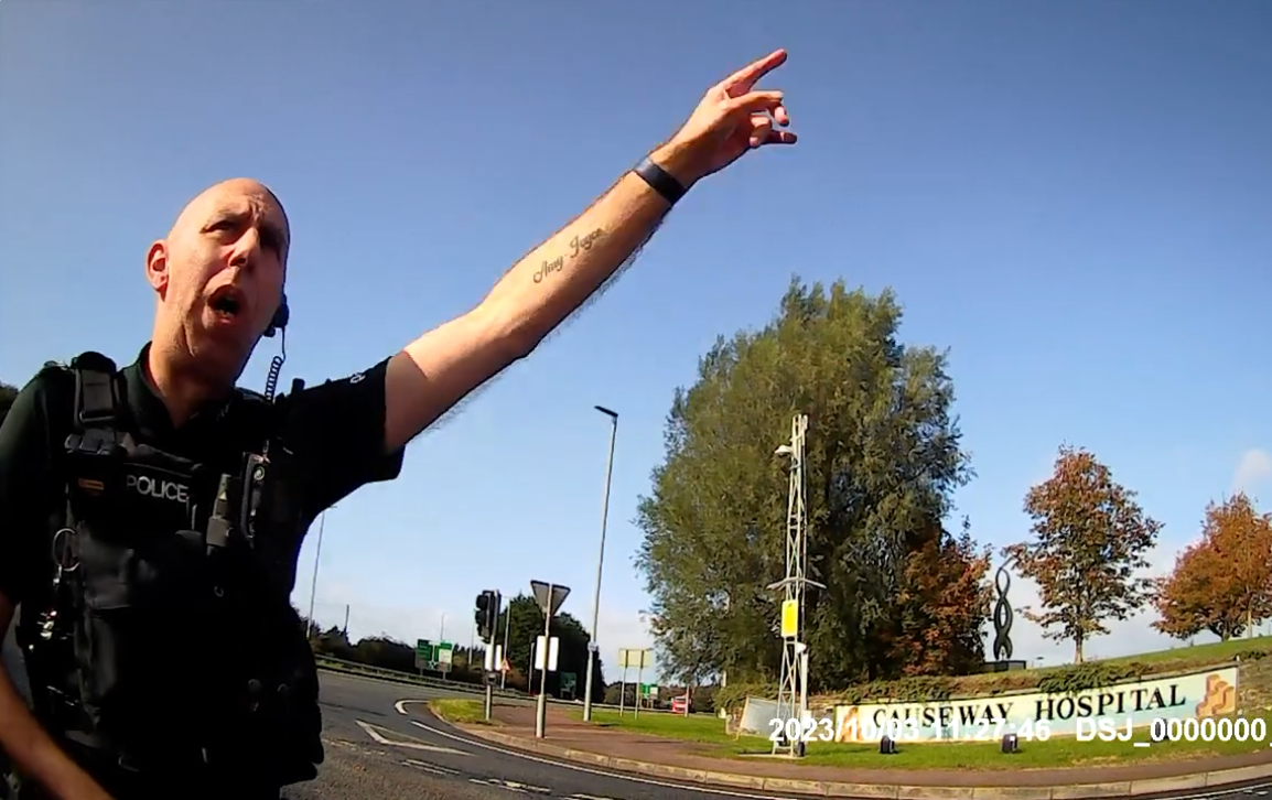 Video screenshot from Claire Brennan's Oct. 2023 arrest for reciting the Lord’s Prayer and holding a sign reading “Pray to End Abortion” outside Causeway Hospital in Coleraine, Northern Ireland/Christian Concern