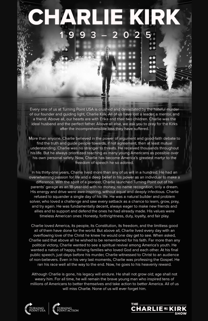 We are deeply saddened by the tragic passing of Charlie Kirk—beloved husband, father, and tireless advocate for his convictions. Charlie’s life was marked by bold courage, steadfast faith, and a vision to awaken hearts and minds across our nation.